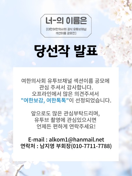 | 제목 | 대한여한의사회 공식 유튜브 섹션명 공모전 당선작 발표 | ||