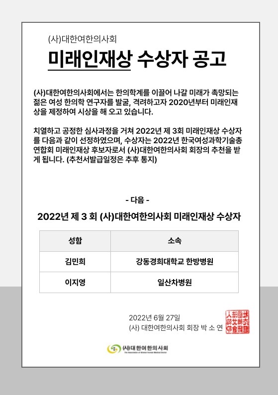 ![]() (사)대한여한의사회에서는 한의학계를 이끌어 나갈 미래가 촉망되는 젊은 여성 한의학 연구자를 발굴, 격려하고자 2020년부터 미래인재상을 제정하여 시상을 해 오고 있습니다. |
