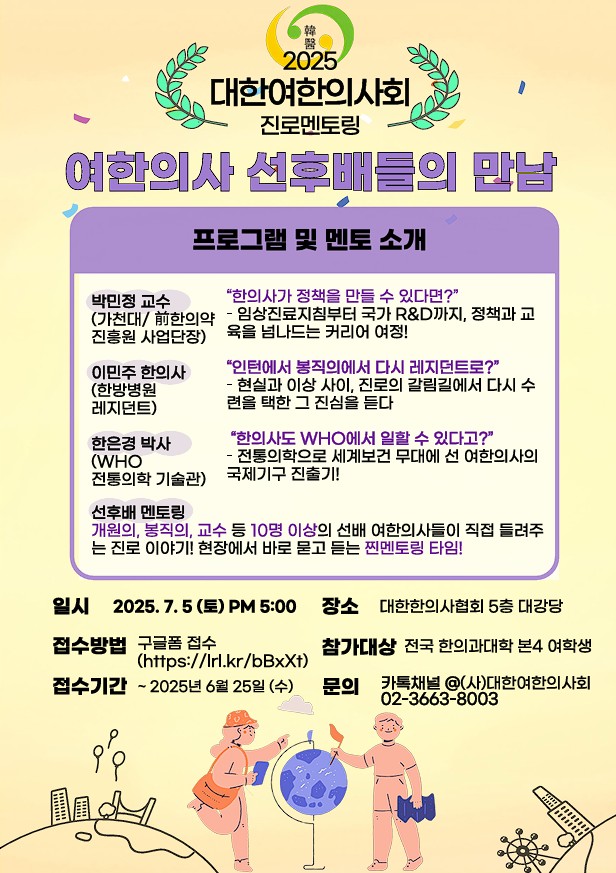 ![]() 2025 대한여한의사회 진로멘토링 "여한의사 선후배들의 만남" - 일시: 2025. 7. 5 (토) 5PM - 장소: 대한한의사협회 5층 대강당 - 대상 : 전국 한의과대학 본과 4학년 여한의대생 - 문의: 02-3663-8003 |