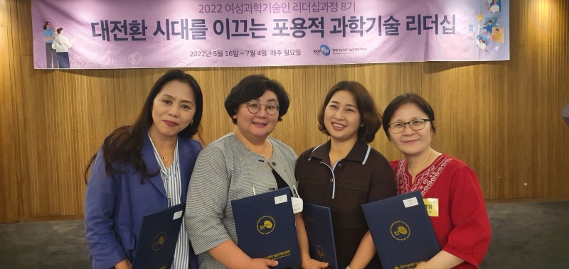 * 여성과총 2022여성과학기술인 리더쉽과정 8기 수료식 * 일시 : 2022년 7월 4일 19시 장소 : 코리아나호텔 참석 : 박소연 회장, 김영선 명예회장, 박미순 부회장, 고희정 대외협력이사 |