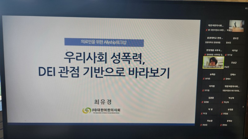 2023.9.6.(수) 오후 5시 30분부터 원광대학교 한방병원 및 장흥통합의료병원 의료인 25명을 대상으로 ‘성폭력 예방을 위한 의료인 Allyship 워크숍’ 1차 온라인 강의를 6일 개최했다. 이번 Allyship 워크숍은 원광대학교한방병원(원장 이정한)의 의뢰를 받아 진행된 사안으로, 한의계 내에서 함께 젠더이슈를 고민하자는 의미에서 외부 강사 초빙이 아닌 여한의사회 최유경 학술이사(가천대학교 한의과대학 교수)가 직접 강사로 나섰다. 이정한 병원장은 인사말에서 “원광대학교한방병원은 성폭력, 성희롱 예방 교육을 법정의무교육에 머무는 것이 아니라 지속적이고 장기적인 교육을 통해 의료인과 환자 모두에게 안전한 의료현장을 만들고자 하는 의지를 갖고 있다”며 “한의 의료기관에서는 원광대병원이 선도적인 역할을 하고자 한다”고 밝혔다. 대한여한의사회는 양성평등교육진흥원과 함께 워크숍 프로그램을 기획했으며, 이번 1차 강의에서는 최유경 학술이사가 ‘우리사회 성폭력, DEI관점으로 바라보기’라는 주제로 한의사의 진료실 내 현황에 대해 함께 이야기 나누는 시간을 가졌다. 2차 강의는 김재희 변호사(한국양성평등교육진흥원 폭력에방통합교육 전문강사)가 오는 11월에 ‘의료 현장에서의 성폭력 성희롱 예방 교육’을 주제로 진행할 예정이다. |